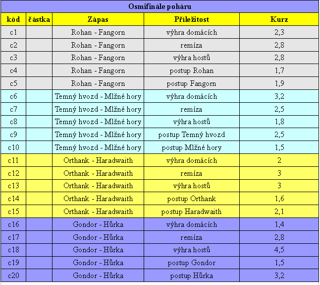 Poznámka: Kurzy c16 a c19 jsou omylem prohozeny. Výhra Gondoru je za 1,5 a postup Gondoru za 1,4.